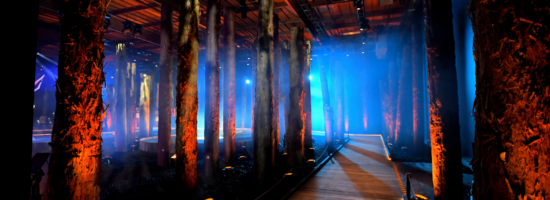 Visitors to the show arrive at a row of anonymous warehouses just south of downtown Los Angeles. Skyscrapers rise in the distance while cars rush by on the highway. But inside, the exhibit is hushed and dark, as you walk through what feels like a towering forest that smells of old wood. Many of the tree trunks are sustainably salvaged redwood trees that have died from insect infestation or drought; others are cast replicas.