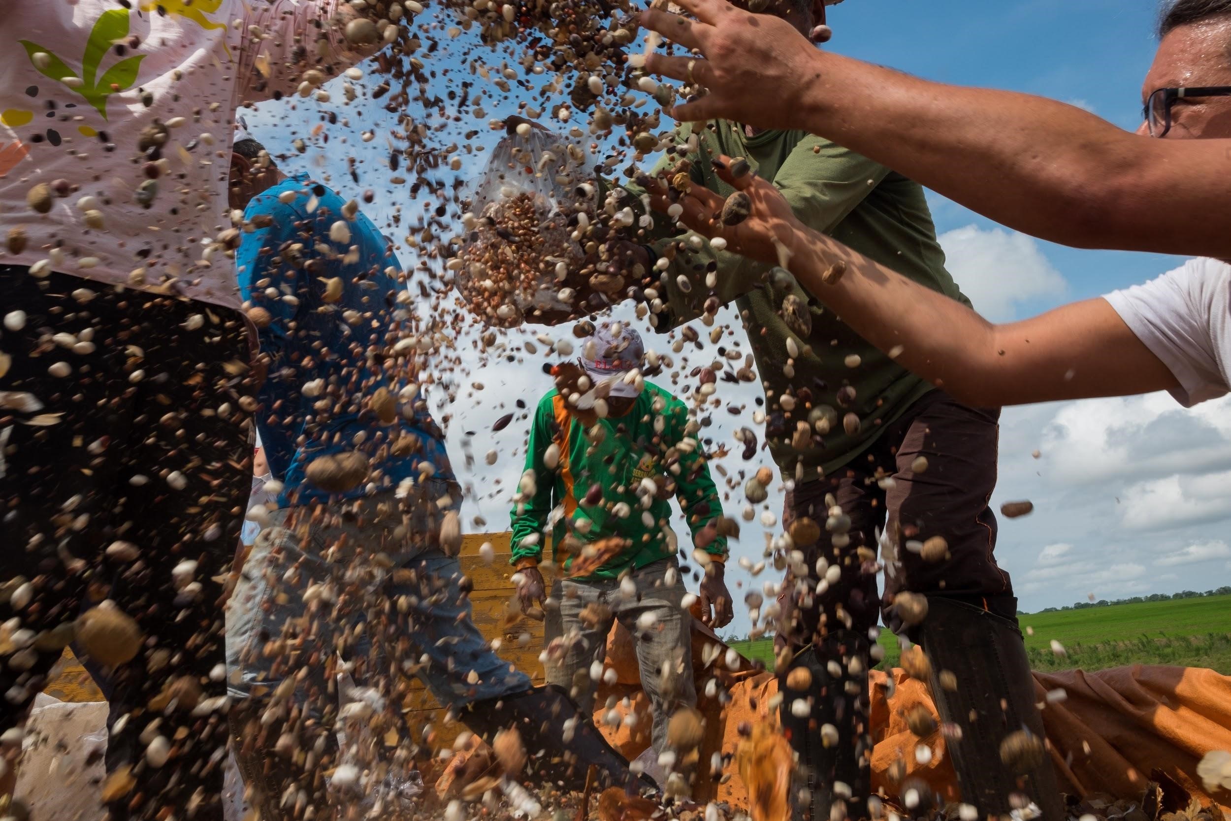 The farming technique known as muvuca involves planting a large mixture of seeds to yield native plants, restoring the soil of degraded areas and growing diverse forests. Here, workers prepare seeds for a muvuca spreading at a restoration site outside Xingu Indigenous Park in the state of Mato Grosso, in west central Brazil. (Photo credit: Inaê Brandão/Conservation International)