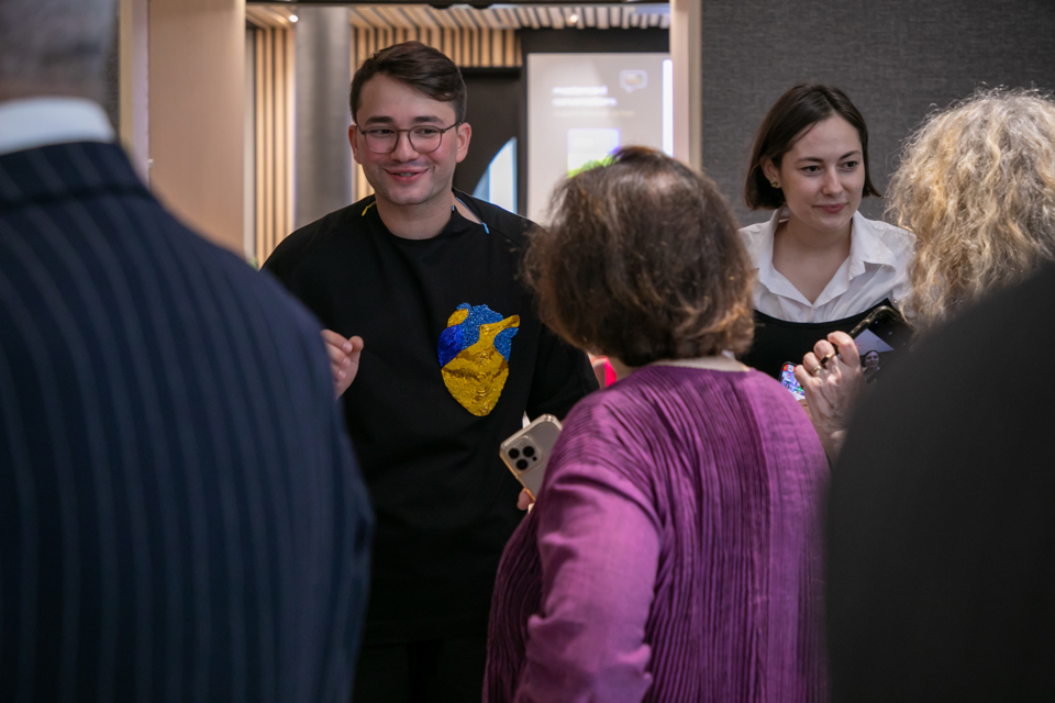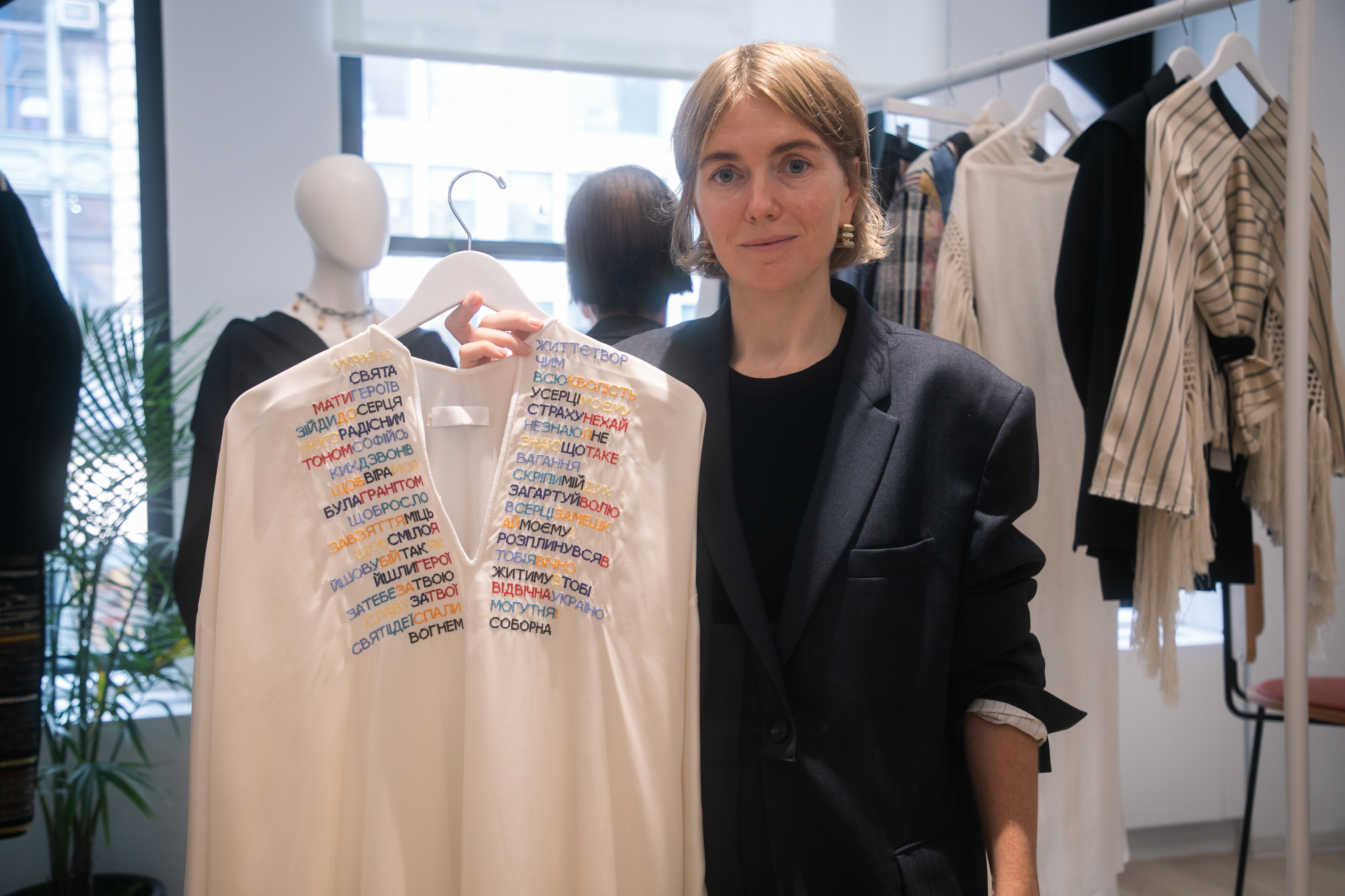 As Litkovska chatted with an admirer, her husband Alex Danylyuk looked on from an armchair. Injured during the fighting and still using a cane, Danylyuk had surprised his wife in New York City. He said she, like the other designers interviewed, is committed to keeping her business in the country: “It’s easy to move it away from the Ukraine, but then it’s not a Ukrainian brand,” he said. For her upcoming collection, he said, she even came up with a new label to sew inside her clothes: “Made in Ukraine, from the war zone with peace.”