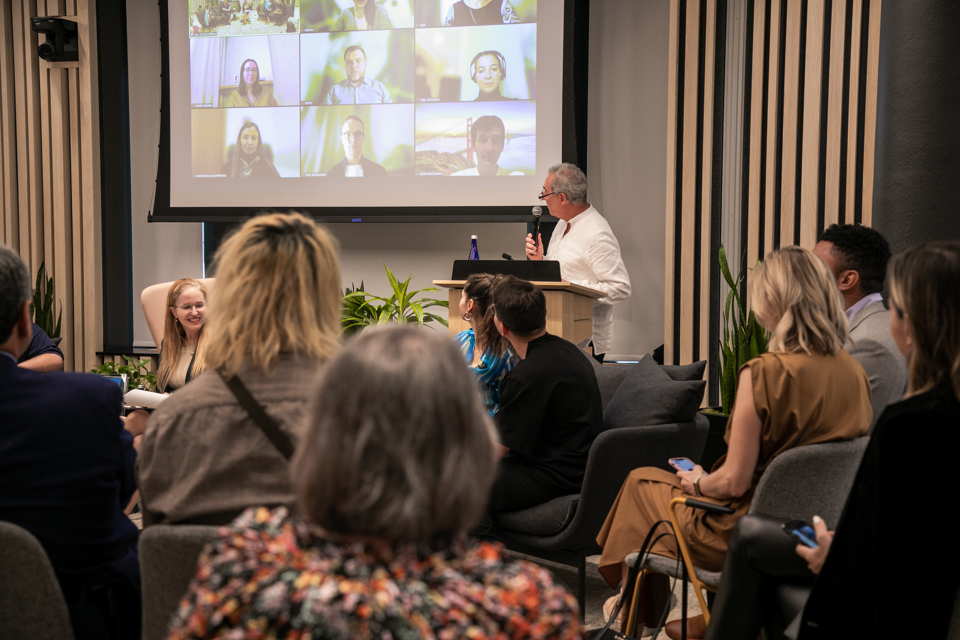 Mastercard's Michael Froman, in a traditional Ukrainian men's shirt called a vyshyvanka, opened the discussion in New York City with a special callout to Mastercard employees from Ukraine who beamed in to the panel. (Photo credit: Rebecca Abraham)
