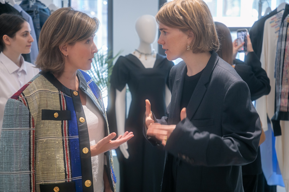 Designer Lilia Litovska, right, talks with Mastercard's Sue Kelsey, who is wearing a Litovska jacket made from recycled clothing that is shredded and rewoven by women artisans in Ukraine. (Photo credit: Rebecca Abraham)