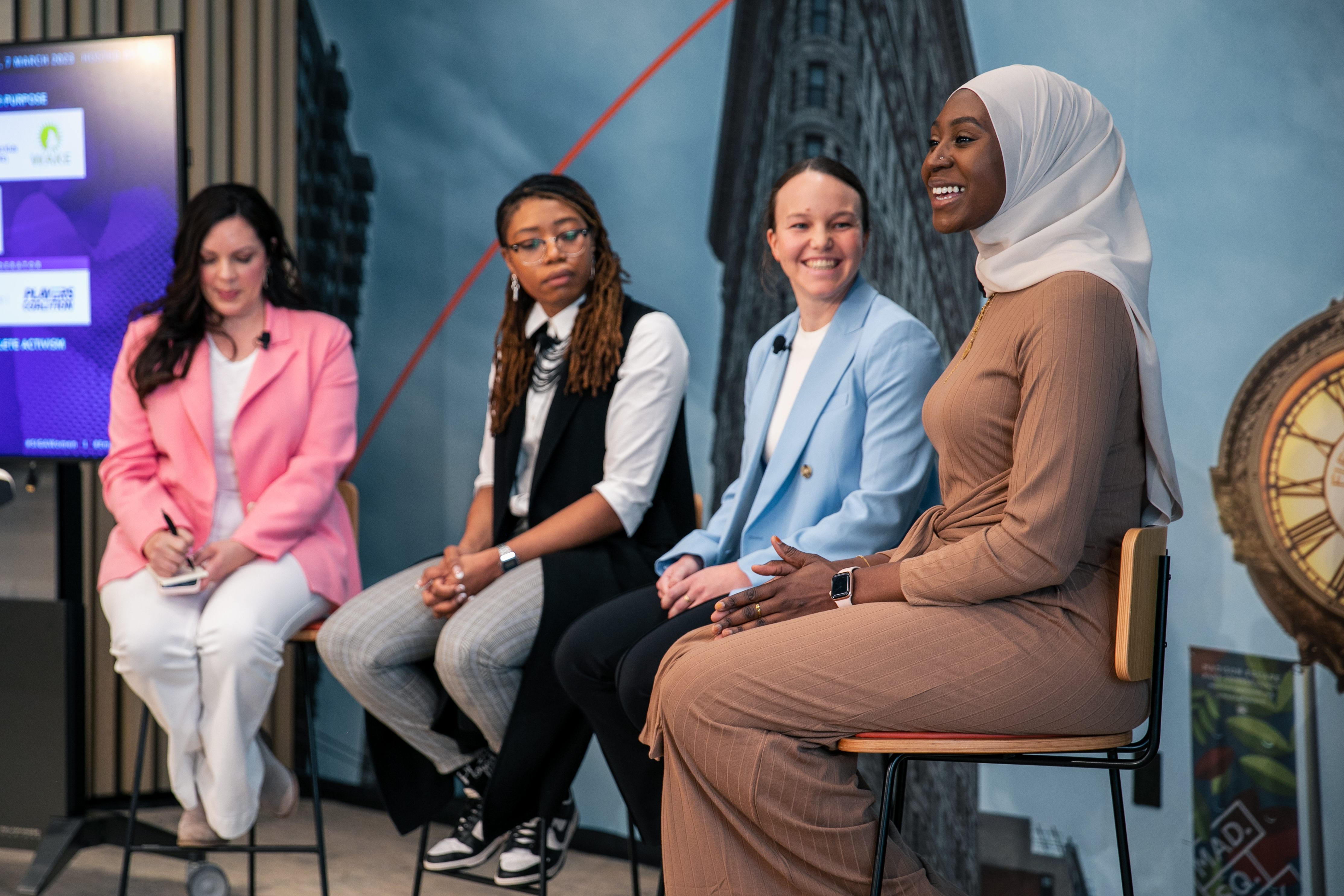Former pro basketball player Batouly Camara, right, founded Women and Kids Empowerment, which sponsors basketball camps, builds courts and provides education scholarships to help keep girls engaged in sport. She was joined on a panel on athlete activism by, from left, LaChica Sports Group CEO Angela LaChica; Lyzz Ogunwo, vice president for international development and global impact for the National Basketball Players Association; and Lauren Esrig, Voice in Sport Foundation head of development. (Photo credit: Rebecca Abraham)