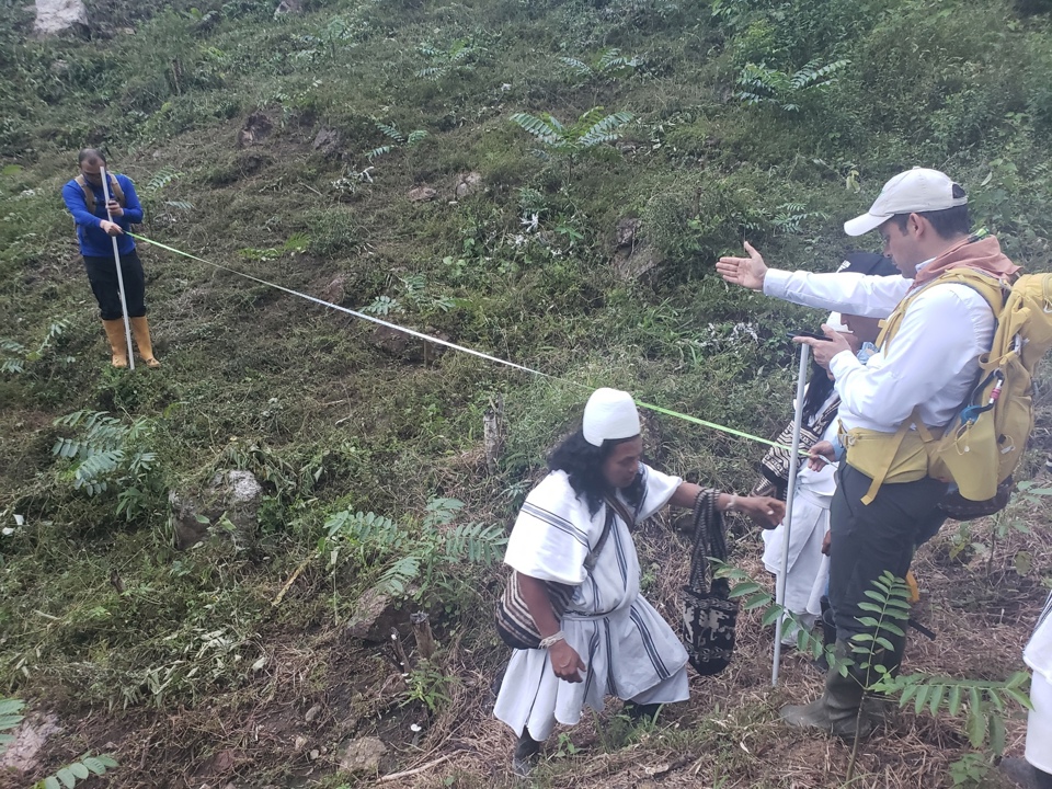 The spiritual leaders of the Arhuaco community, typically closed to outsiders, guided Conservation International in the restoration project, including choosing which type of trees to plant and which areas needed the most protection. Here, they are setting up tree monitoring plots to ensure restoration is successful. (Photo credit: Ruth Metzel/Conservation International©)