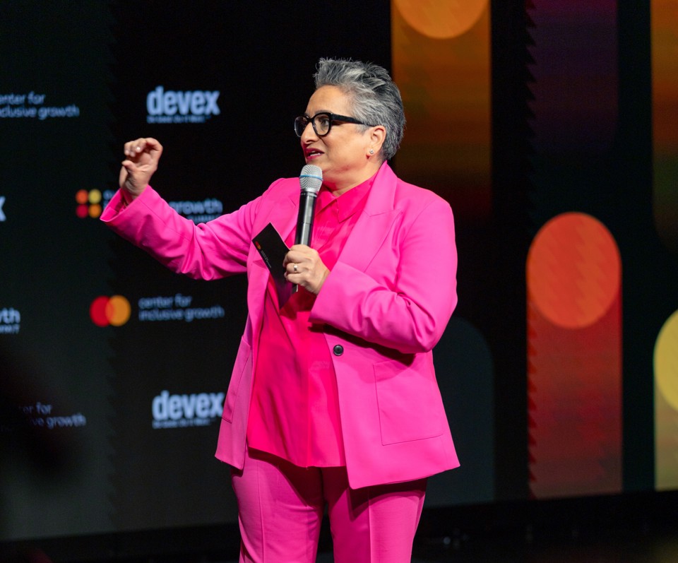 Shamina Singh, the founder and president of the Mastercard Center for Inclusive Growth, opened the summit Thursday with a call to action: "We see the impossible become possible, but only if we follow this advice: We listen with empathy. We meet each other with compassion, with decency. We act with a sense of urgency." (Photo credit: Rebecca Abraham)
