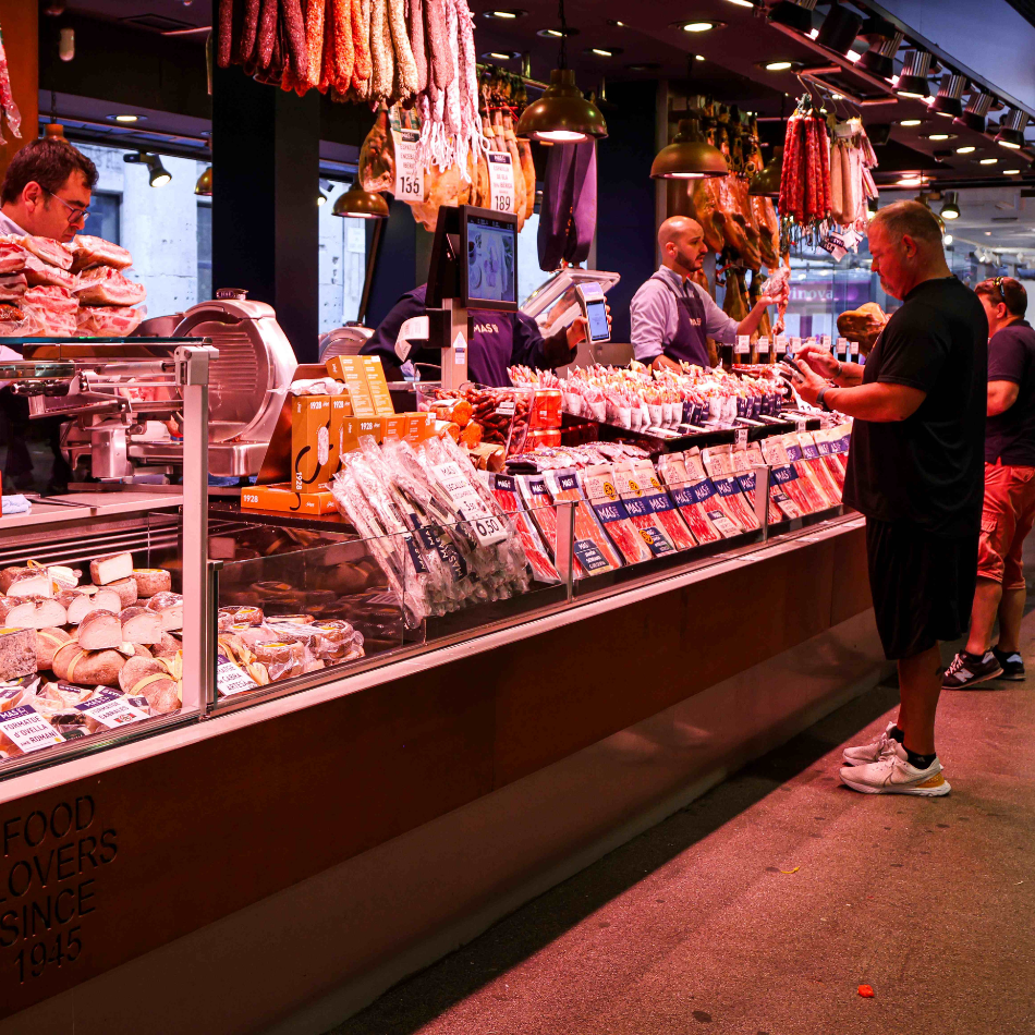 Greeting them is a giant labyrinth made up of more than 300 stalls. Stands groan with locally grown produce: pristine, crimson strawberries, plump, wine-dark figs and bunches of sweet, porcelain-tipped scallions known as calçots, their roots still caked with soil. Jostling for space are the deli counters, which sell every olive under the sun, from green and savory Manzanillas, used in tapenades, to golden-brown, nutty Arbequinas, enjoyed as appetizers. At a neighboring charcuterie stand, a highly skilled cutter shaves huge legs of jamón Ibérico into gossamer-thin marbled slivers of ham that melt on the tongue.