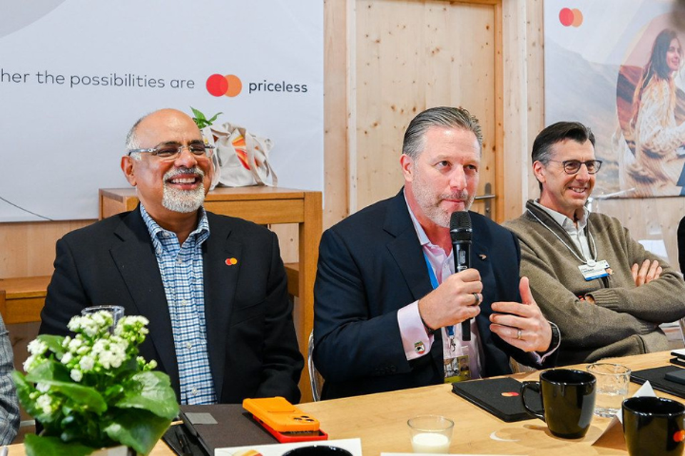 McLaren Racing CEO Zak Brown, center, is flanked by Raja Rajamannar, left, Mastercard chief marketing and communications officer, and Jorn Lambert, right, Mastercard chief product officer, who co-hosted a Davos roundtable on how passion, data-driven insights and a high-performance mindset can drive growth in the intelligent age.