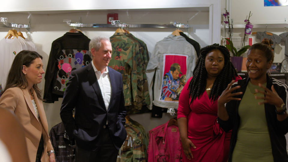 Mastercard's Michael Froman, right, vice chairman and president, Strategic Growth, and Linda Kirkpatrick, president, North America, left, visits Da Spot, where owner Michelle Cadore talks about what inspired her to open her shop and how it has become a hub for other creatives in the area.