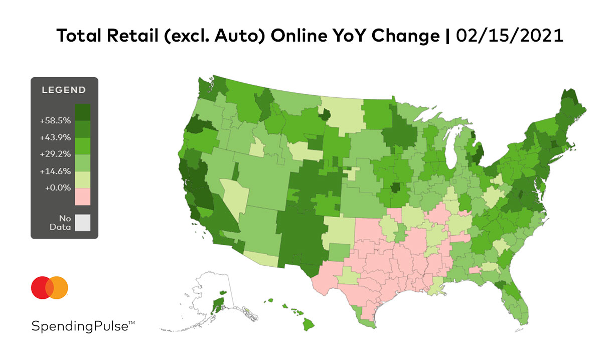 At the local level, the situation varied widely. A series of winter storms the week ending February 20 affected retail activity across the South—no state more than Texas. Mastercard SpendingPulse analysis shows how the extreme winter freeze impacted retail sales locally and at the national level.