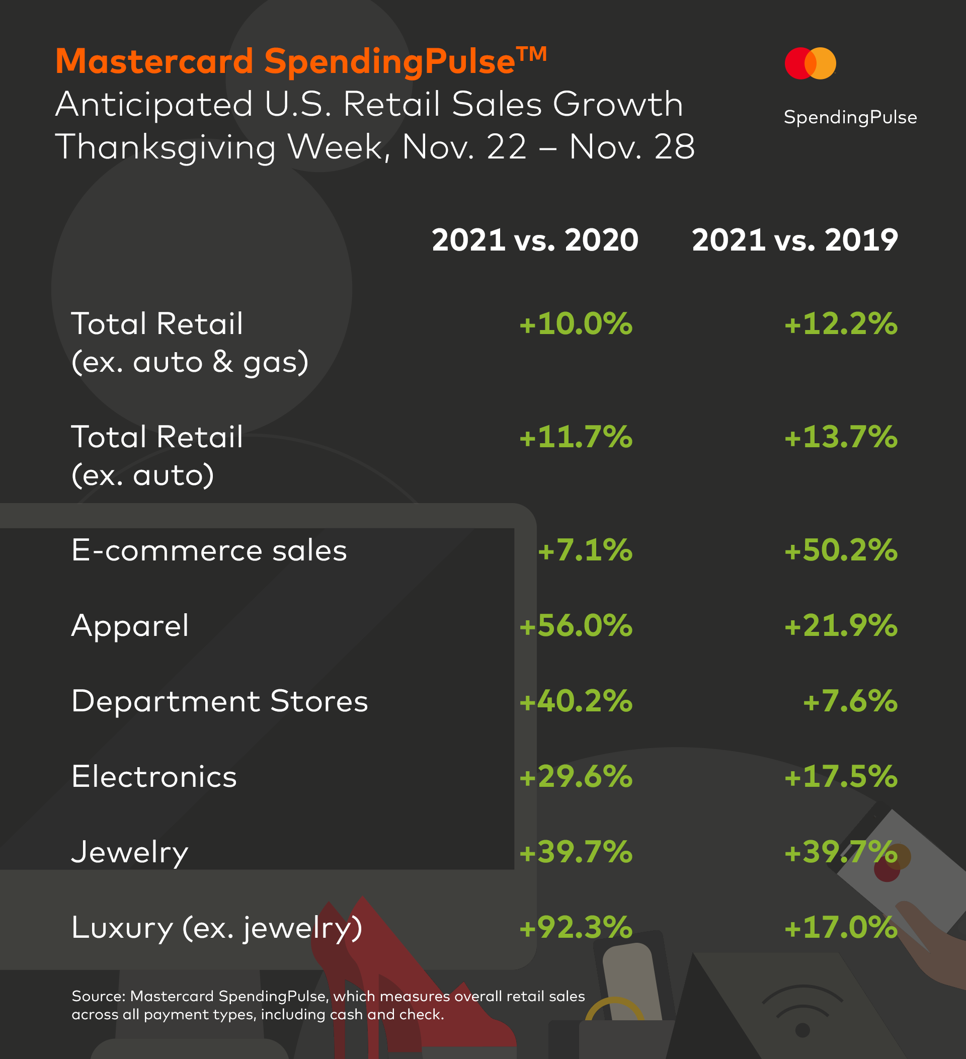 With holiday cheer in the air and shoppers returning to stores in force, U.S. retail sales during Thanksgiving week are expected to grow 10.0% YOY and 12.2% YO2Y, excluding auto and gas. According to Mastercard SpendingPulse™, which measures overall retail sales across all payment types including cash and check, e-commerce is also expected to experience sustained growth, increasing 7.1% YOY and 50.2% YO2Y for the week running November 22 through November 28.