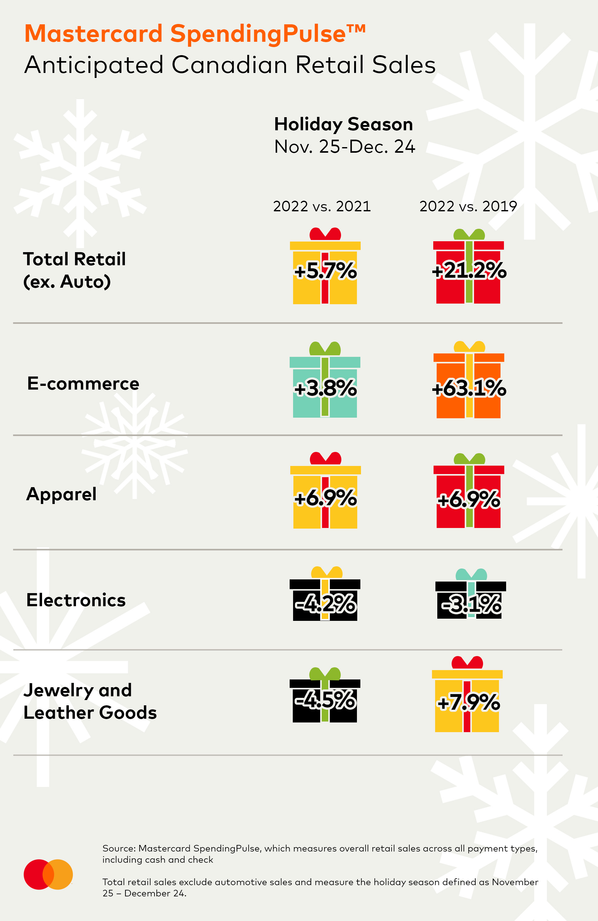 November 17, 2022This holiday season, from November 25 to December 24, Canadian retail sales (excluding Automotive) are expected to increase +5.7%* year over year (YOY) and +21.2% since pre-pandemic (2019), according to the Mastercard SpendingPulseTM holiday forecast. E-commerce retail sales are expected to grow +3.8% YOY (+63.1% YO3Y). Mastercard SpendingPulse measures in-store and online retail sales across all forms of payment and is not adjusted for inflation.