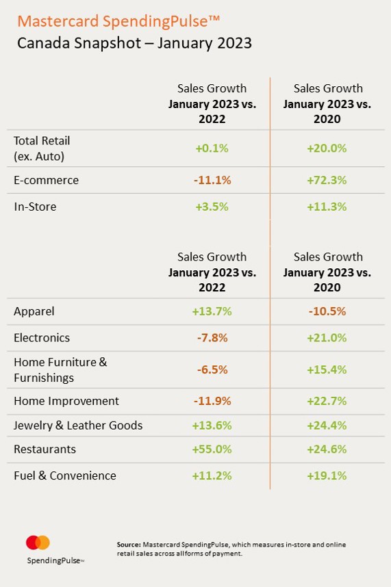 March 2, 2023 | TorontoCanadian Retail sales, excluding Automotive, increase marginally at +0.1% YOY in January, according to Mastercard SpendingPulseTM, which measures in-store and online retail sales across all forms of payment. E-commerce sales also fall -11.1% YOY in January. In-Store sales were up +3.5% YOY as we enter a new year with no pandemic restrictions. Mastercard SpendingPulse accounts for nominal spending and is not adjusted for inflation.