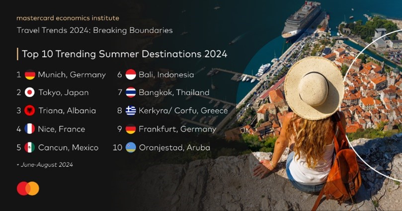 Top 10 trending destinations — and dupes. While Japan has emerged as the global frontrunner for top destination in the last 12 months, Munich ranks as the top trending destination for this summer (June-August 2024). Notably, Albania ranks third in the list of top trending destinations this summer according to the Mastercard Economics Institute, driven largely by savvy travelers seeking authentic Euro-vibes à la neighboring Italy and Croatia, but for less.