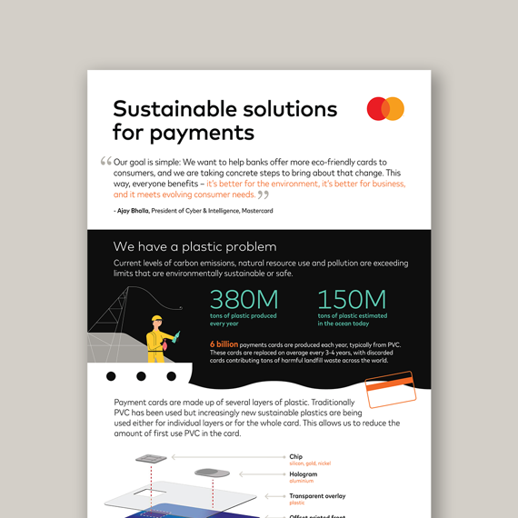 Today, Mastercard’s sustainable card offerings are available to consumers in over a dozen countries globally and more than 60 financial institutions have issued cards with approved materials made from recyclable, bio-sourced, chlorine-free, degradable and ocean plastics. These institutions include Crédit Agricole and Mauritius Commercial Bank, as well as Santander, which will issue cards shortly. With this resource, banks can learn more about these alternatives, connect to card manufacturers and ultimately augment their own sustainability initiatives with a systemic change to their supply chain.