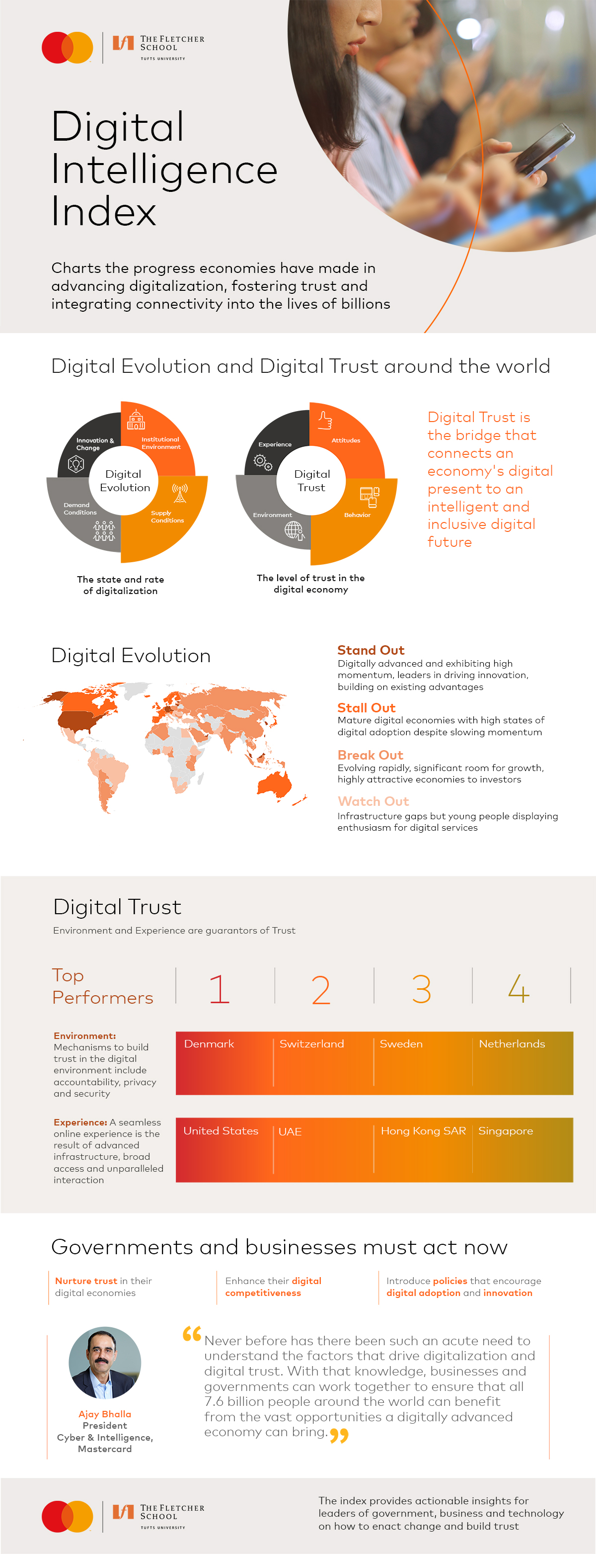 About the Digital Intelligence Index: The Digital Intelligence Index, researched and authored by The Fletcher School at Tufts University in partnership with Mastercard, provides world-leading, state-of-play reporting on the progress that countries have made in advancing their digital economies. Building upon earlier editions in 2014 and 2017, this year’s index paints a picture of global digital development, sheds insight on key factors driving change and momentum, and unpacks what this means for economies facing the challenge of a global pandemic and post-pandemic future. This year’s index will be presented on an interactive platform, allowing users to compare and analyze key indicators for digital development and competitiveness across economies and regions.