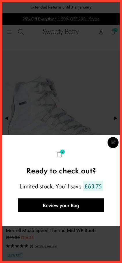 On Black Friday, Sweaty Betty wanted to minimize the time between an add-to-cart action and the final transaction, ensuring more conversions from site visitors. To achieve this, they implemented a personalized pop-up to visitors containing scarcity messaging (“limited stock”), as well as the amount of money the visitor would save if the checkout occurred at that moment. This number was based on the individual’s cart and differed for each user.