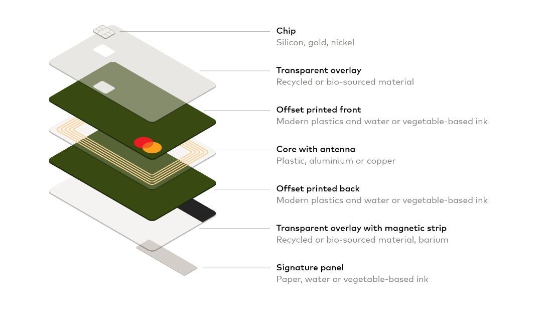 V roku 2018 spoločnosť prostredníctvom laboratória digitálnej bezpečnosti spoločnosti Mastercard spustila partnerstvo Greener Payments s výrobcami kariet Gemalto, Giesecke+Devrient a IDEMIA s cieľom znížiť používanie PVC plastu prvého použitia pri výrobe kariet. Zúčastnené banky Mastercard pôsobia vo viac ako 80 rôznych krajinách sveta. V roku 2021 spustila systém ekologickej certifikácie kariet Mastercard („CEC“).