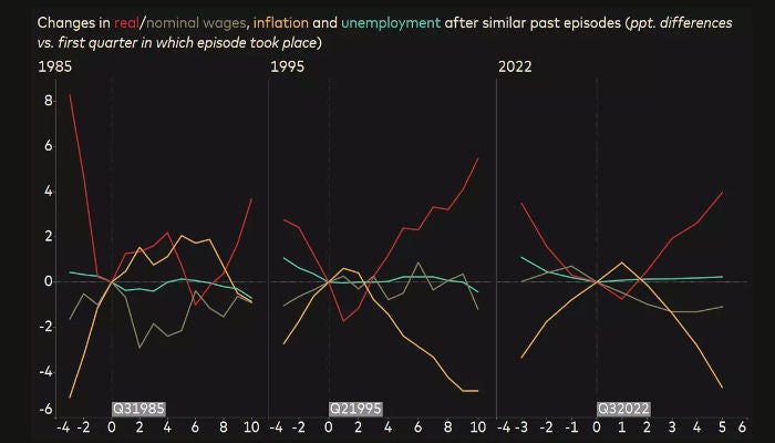 Chart 6: Historical look at labor-price dynamics - low unemployment, rising wages, higher prices, lower purchasing power (quarters after the episode)