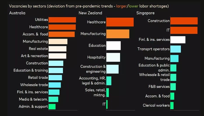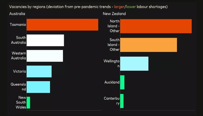 The hospitality and health care sectors face the most significant lack of workers compared to sectors such as IT and financial services. This is based on posted job vacancies in Australia and New Zealand since the beginning of 2021 compared to pre-pandemic trends. In addition, smaller towns and more remote locations in the two countries find it harder to attract workers than in the bigger cities.