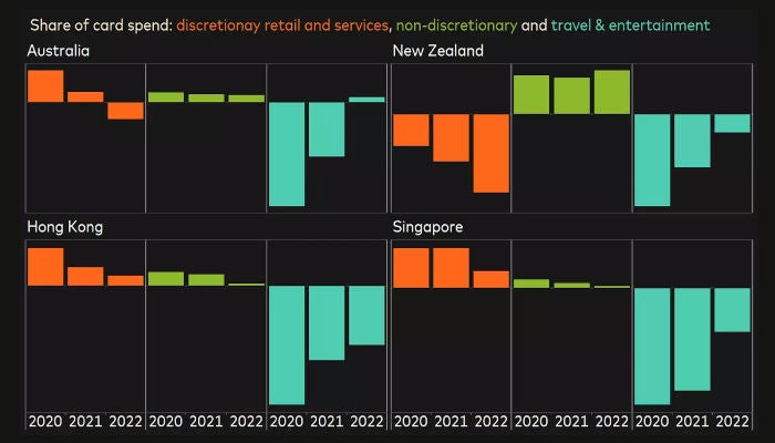 In addition, consumers globally are trading down on essentials to enable ongoing spending on experiences such as travel and hospitality. These previously ‘forbidden fruits’ have seen increased demand despite high prices, hurting discretionary retail and other services.