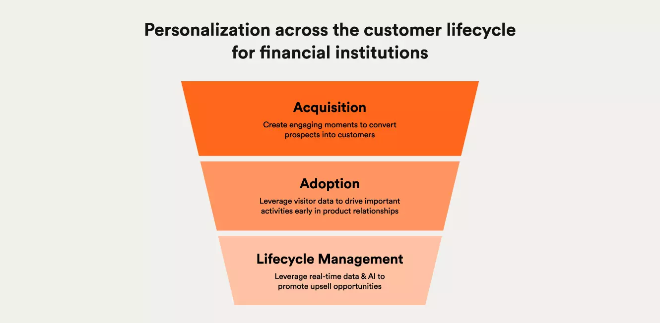 There are three main customer lifecycle stages that financial brands should think about when integrating personalization into the larger business strategy: acquisition, adoption, and lifecycle management.