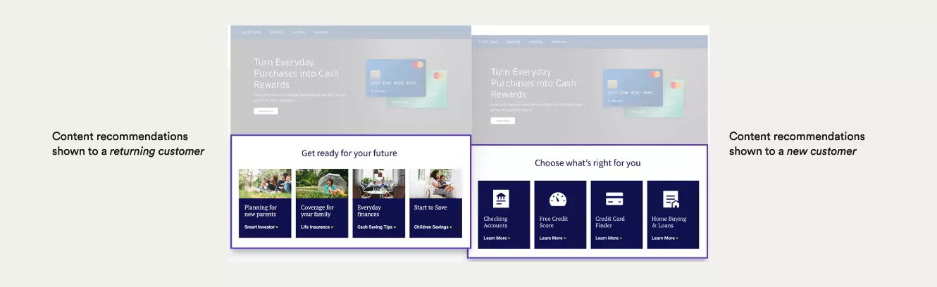 For example, the variation on the left incorporates web personalization to serve a tailored experience for a returning customer with specific, AI-powered content recommendations that correspond to the available customer data, whereas the experience on the right for a new customer showcases generic and broad resources in an effort to learn more about their needs and interests and to serve deeper, more relevant recommendations in the future.