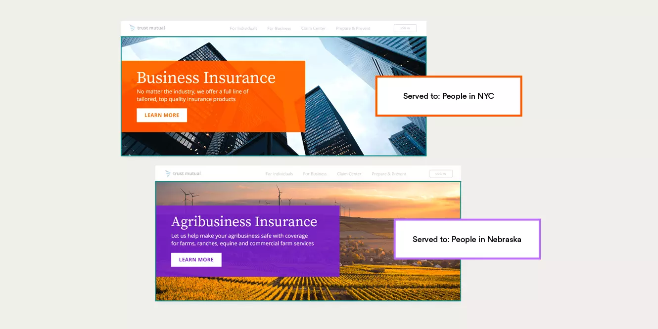 For example, one might serve a homepage hero banner promoting business insurance to people in New York City, and another version for agribusiness coverage in Nebraska. By doing so, teams can ensure greater relevance right out of the gate, a higher likelihood of continued engagement, and lower rates of site abandonment.