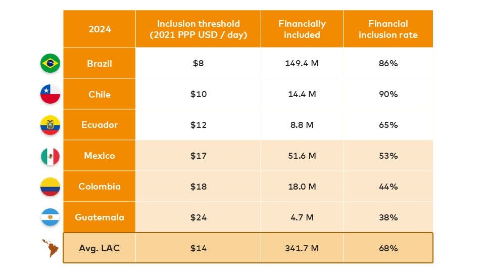 Figure 3: Mexico, Colombia and Guatemala have higher minimum daily spending thresholds for financial inclusion than regional peers.