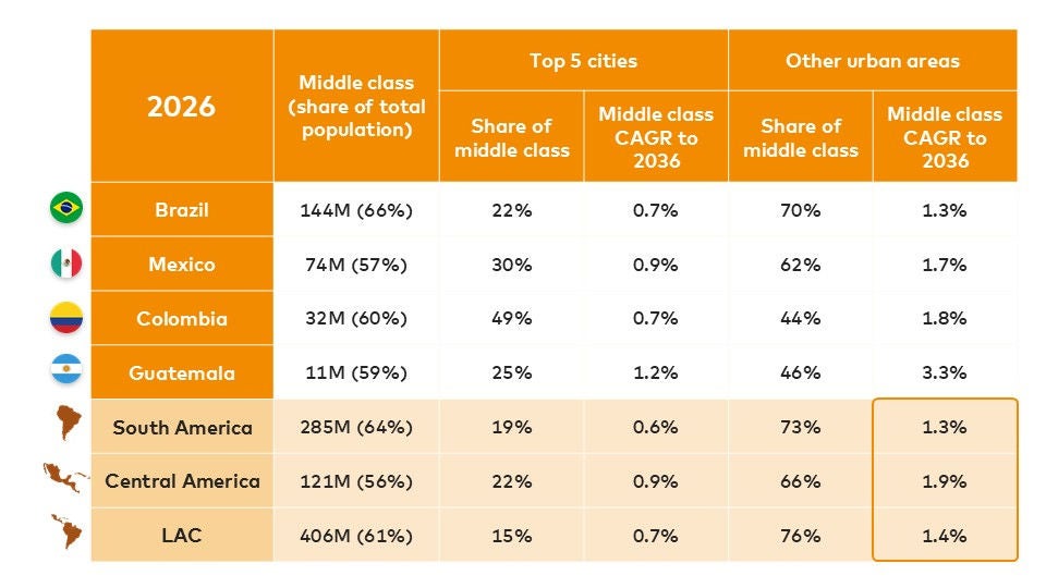 Even Brazil and Mexico — the region’s largest middle-class growth engines — are seeing growth shift to secondary cities with thinner labor markets and greater exposure to shocks. In many of these cities, access to finance lags behind major metros, making it harder for households to withstand disruptions and remain middle class. Across South and Central America, smaller urban areas are projected to drive most future middle-class growth (see figure 2).