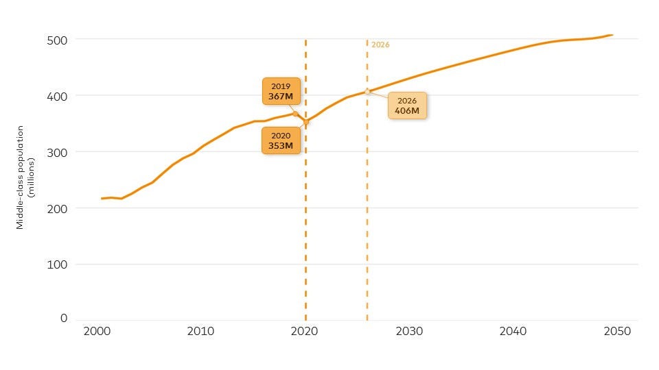 Figure 2: Megacities remain anchors, but middle-class growth is shifting beyond top metros toward other urban areas.