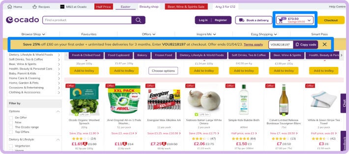 For first-time visitors, the Ocado product listing page looks like the above, showcasing a wide range of products and promoting an exclusive first-time discount banner at the top of the page. Personalized messaging in the cart shows the visitor the amount of money saved based on the current cart total.